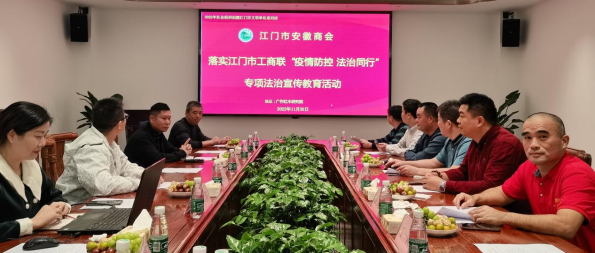 为贯彻落实江门市政府、江门市工商联关于疫情防控的部署要求,提升商会会员企业疫情防控知识,11月30日江门市安徽商会开展了疫情防控,法治同行专项法治宣传教育活动。江门市安徽商会执行会长李宜春、常务副会长尹付林、张文彬、马献良。江门市安徽商会党支部宣传委员丁一训、商会监事长徐涛、监事汪绪平、商会秘书长惠永新、新会片区会员及秘书处工作人员参加本次活动。